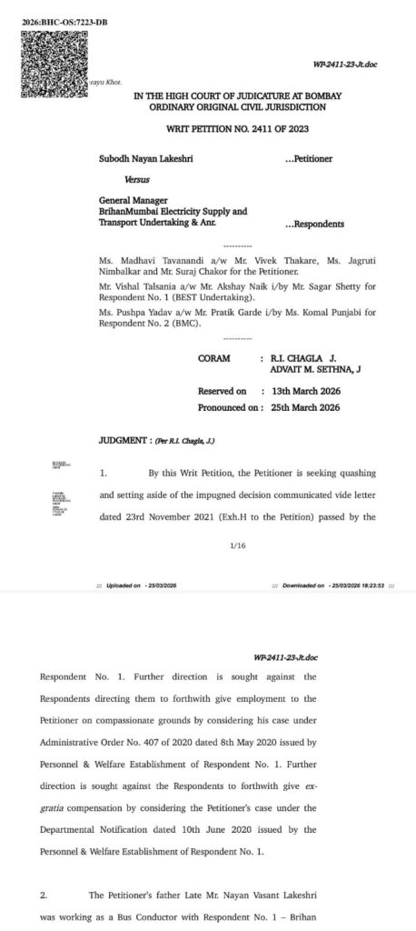 मुंबई, २५ मार्च २०२६: मुंबई उच्च न्यायालयाच्या खंडपीठाने (न्यायमूर्ती आर. आय. चगला व न्यायमूर्ती अद्वैत एम. सेठना) दिलेल्या महत्त्वपूर्ण आदेशात ब्रिहन्मुंबई विद्युत पुरवठा व परिवहन उपक्रम (BEST) कर्मचारी स्व. नयन वसंत लोकेश्री यांचा कोविडकाळात सेवेत असताना झालेल्या मृत्यूप्रकरणी त्यांच्या वारसांना ५० लाख रुपये नुकसानभरपाई आणि अनुकंपा तत्त्वावर नोकरी देण्याचे निर्देश BEST ला दिले आहेत.याचिकाकर्ता सुबोध नयन लोकेश्री यांनी सानुग्र अनुदान आणि नोकरी मिळावी म्हणून Adv. विवेक ठाकरे Adv. सूरज चकोर आणि जागृती निंबाळकर यांच्यामार्फत मुंबई उच्च न्यायालयात याचिका दाखल केली होती.