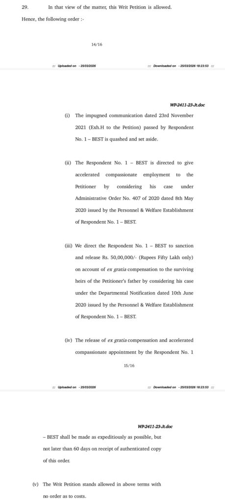 याचिकाकर्त्या सुबोध लोकेश्री यांना प्रशासकीय आदेश क्र. ४०७/२०२० अंतर्गत त्वरित अनुकंपा नोकरी देण्यात यावी.• स्व. नयन लोकेश्री यांच्या वारसांना विभागीय अधिसूचना दिनांक १० जून २०२० नुसार ५० लाख रुपये (रु. ५०,००,०००/-) सानुग्र अनुदान (एक्स-ग्रेशिया भरपाई) देण्यात यावे.• दोन्ही बाबींची अंमलबजावणी प्रमाणित प्रति प्राप्त झाल्यापासून ६० दिवसांच्या आत करावी.या निकालामुळे कोविडकाळात कर्तव्यदक्ष राहून प्राण गमावलेल्या BEST कर्मचाऱ्यांच्या कुटुंबीयांना न्याय मिळाला आहे. याचिकाकर्ते सुबोध लोकेश्री यांनी या न्यायालयीन लढाईत यश मिळवल्याबद्दल समाधान व्यक्त केले आहे.